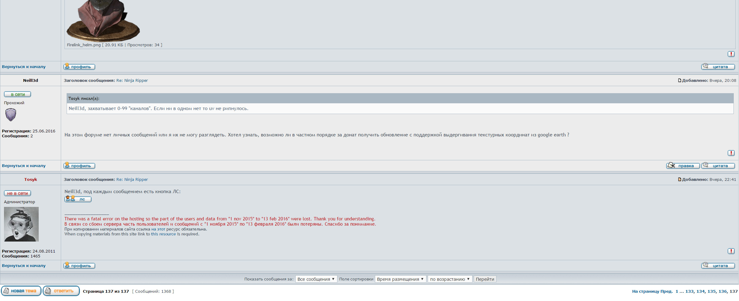 На этом форуме нет личных сообщений или я их не могу разглядеть. Хотел узнать, возможно ли в частном порядке за донат получить обновление с поддержкой выдергивания текстурных координат из google earth ?Tosyk писал(а):Neill3d, захватывает 0-99 "каналов". Если ни в одном нет то uv не рипнулось.